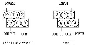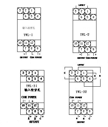 注: 1、YWF、YWL系列交流电流变送器输入线从变送器外壳设置的穿孔穿过,不分J性。